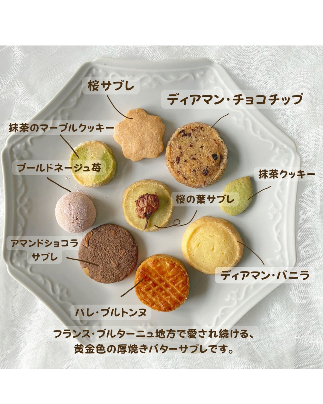 本格的なフランス伝統菓子「パレ・ブルトンヌ」から、季節感たっぷりの「桜サブレ」まで、バラエティ豊かな10種類を詰め込みました。